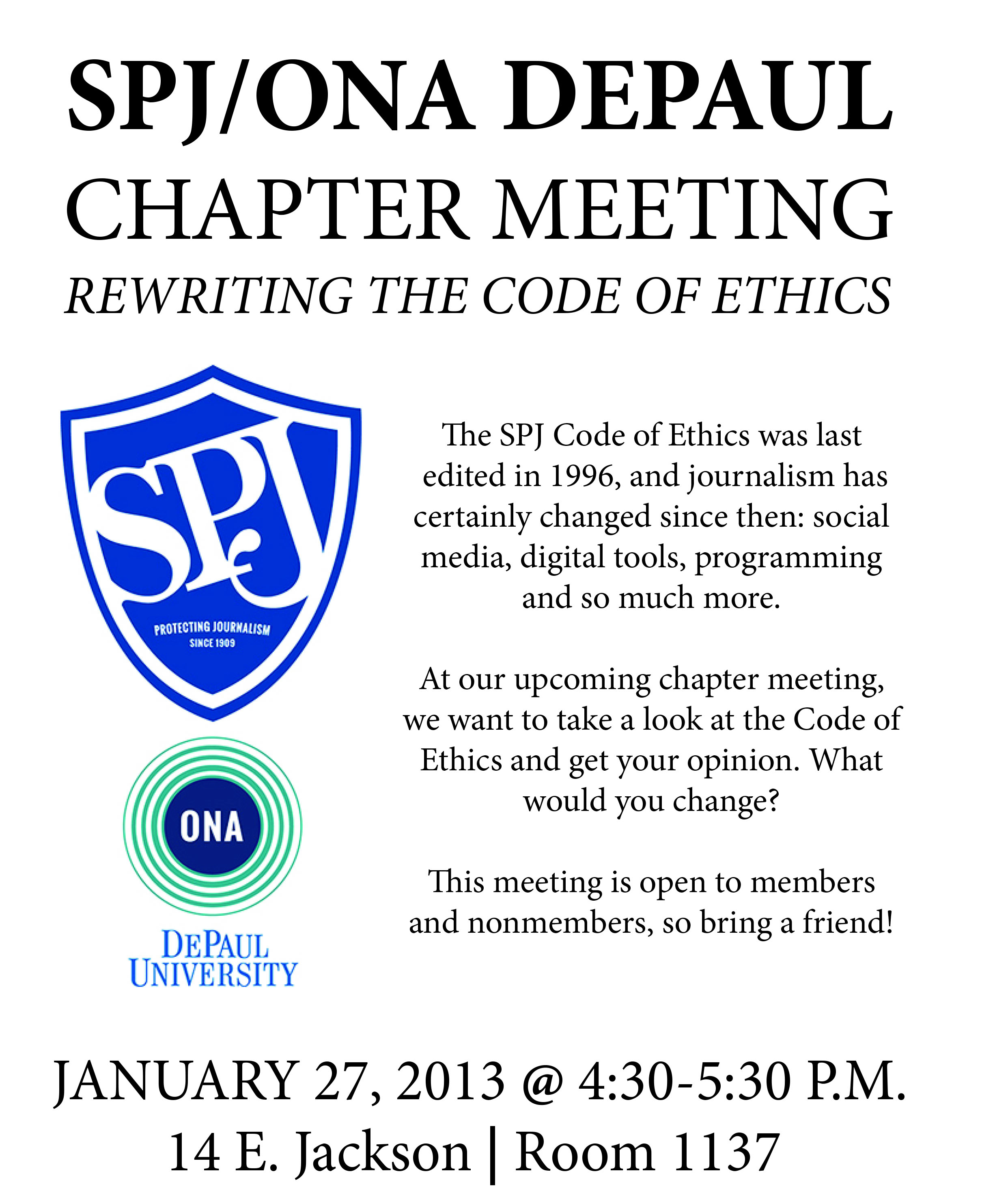 All student members, nonmembers, alums and DePaul University College of Communication faculty are welcome to attend. Have suggestions for changes to the code? Tweet them to @spjonadepaul and use the #spjcode hashtag.